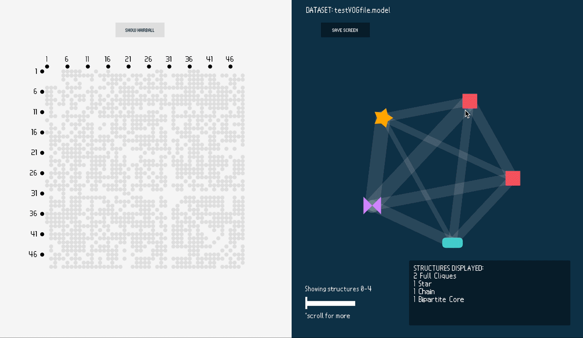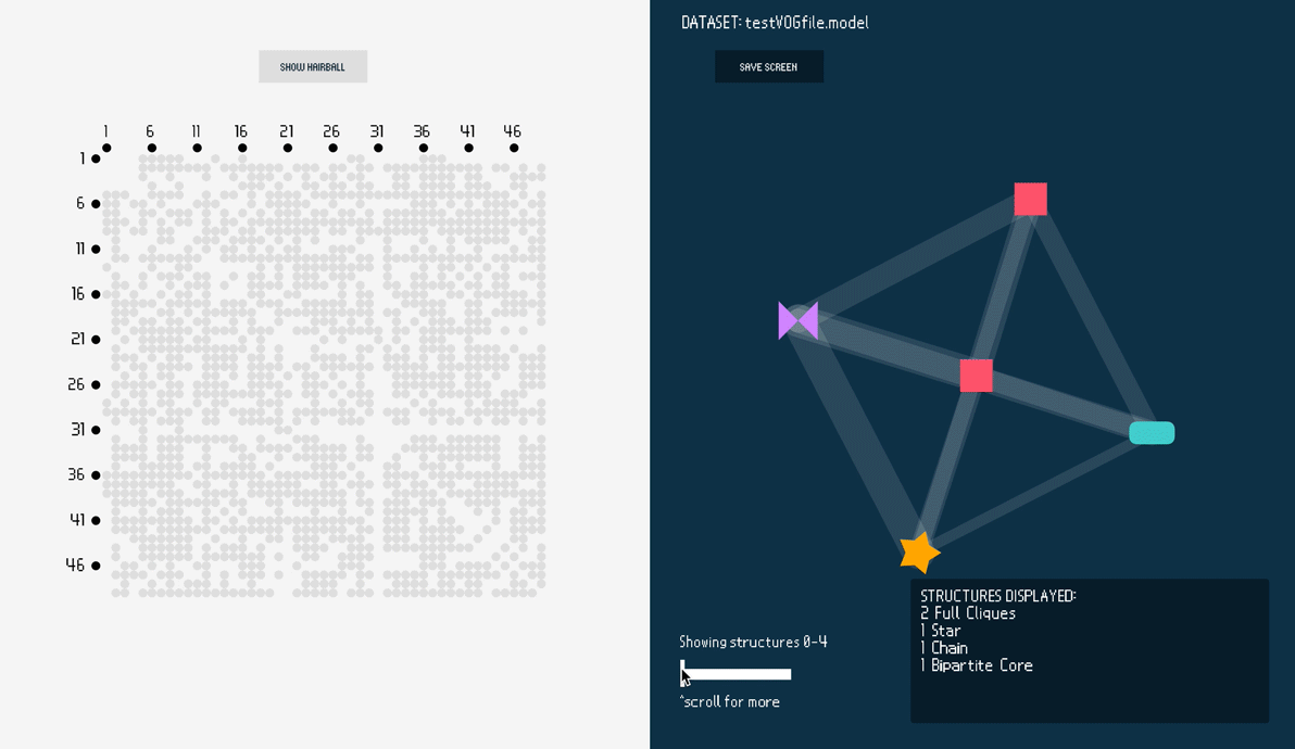 The original graph's constituent subgraphs (such as cliques, stars, and chains) are represented as 'glyphs'. If two subgraphs had any nodes in common, their glyphs would be connected by "regions"--which are edges with thicker line weights and lower opacities. Spy plot and node-link diagram views are used to supplement the visualization; the views can be switched using the ‘Show Hairball’/‘Show Spy Plot’ buttons. Selecting a glyph highlights its location on the spy plot and node-link diagram.